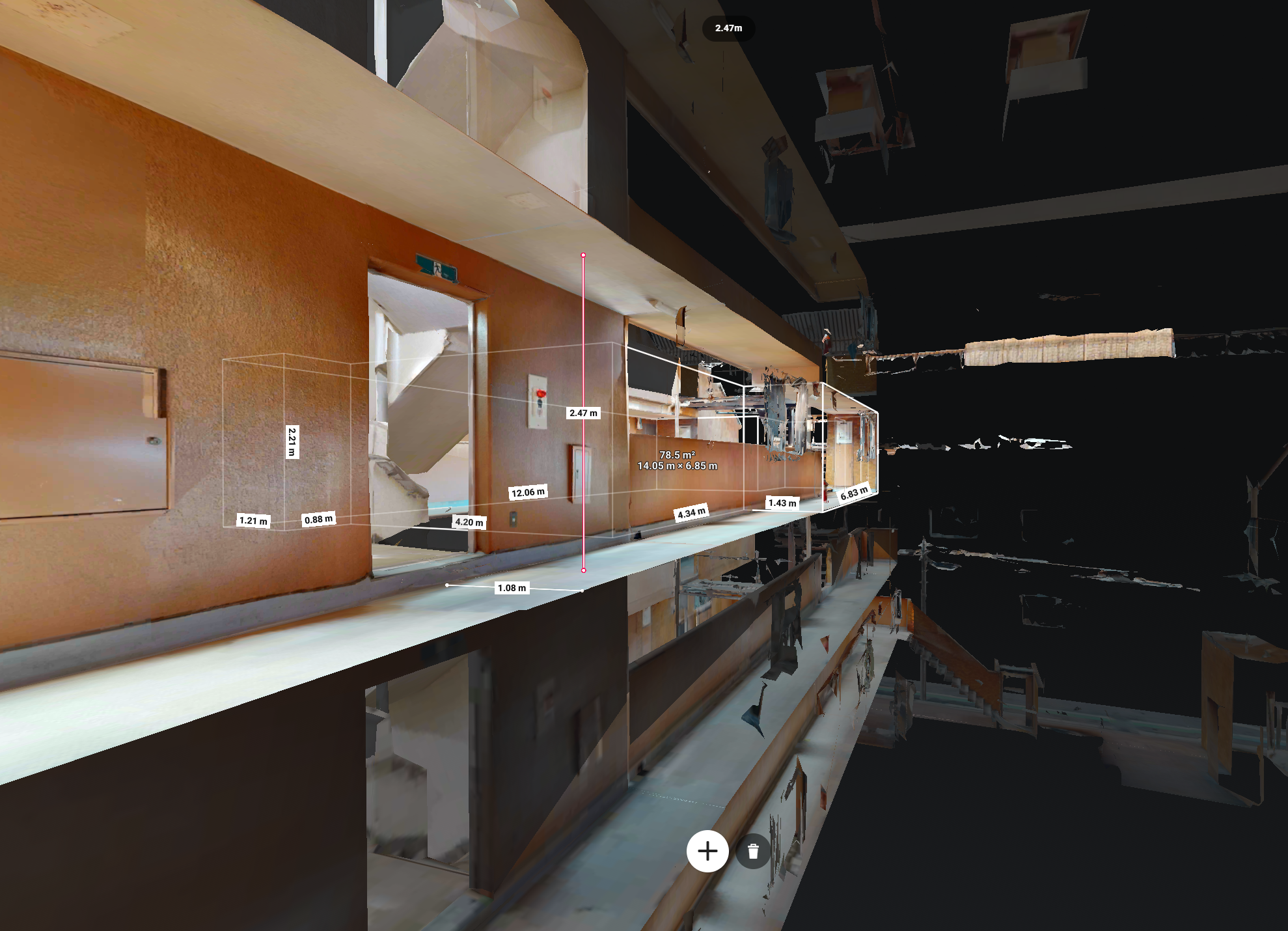 建物内・外を専用カメラでスキャンすることで3Dモデリングの生成、修繕部位の確認や簡易測定が可能となる